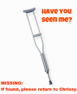 On another note, my crutch armpit squishy pads came in- and I went to go put them on my crutches and low and behold... I lost one. How do you lose a crutch? Oh I am not sure, but I certainly managed to do so. So I have 2 weeks to pray to St. Anthony as much as possible and hope that my missing crutch turns up. This is typical Chrissy. COME ON!!!!!!!!!!!!!